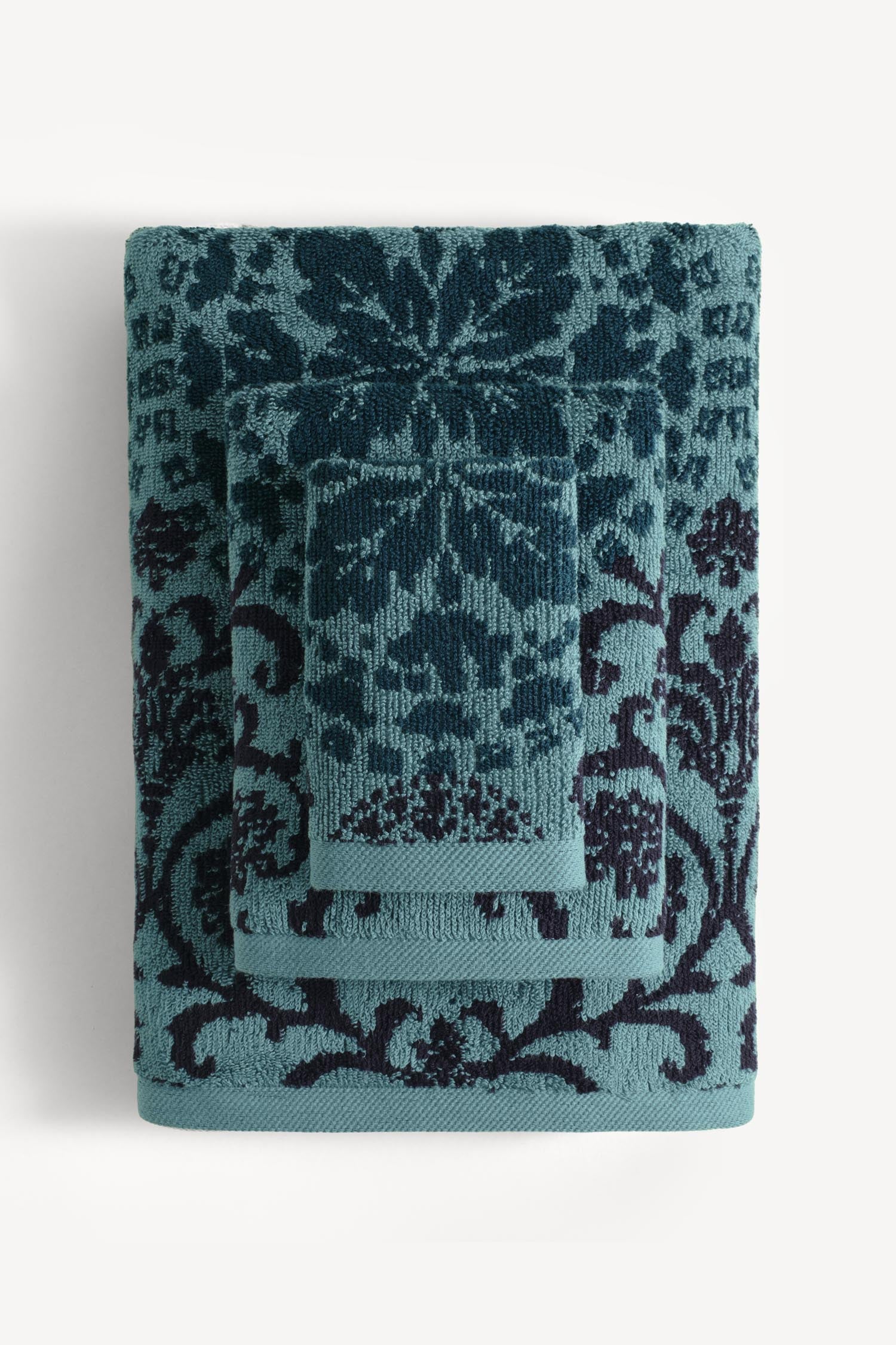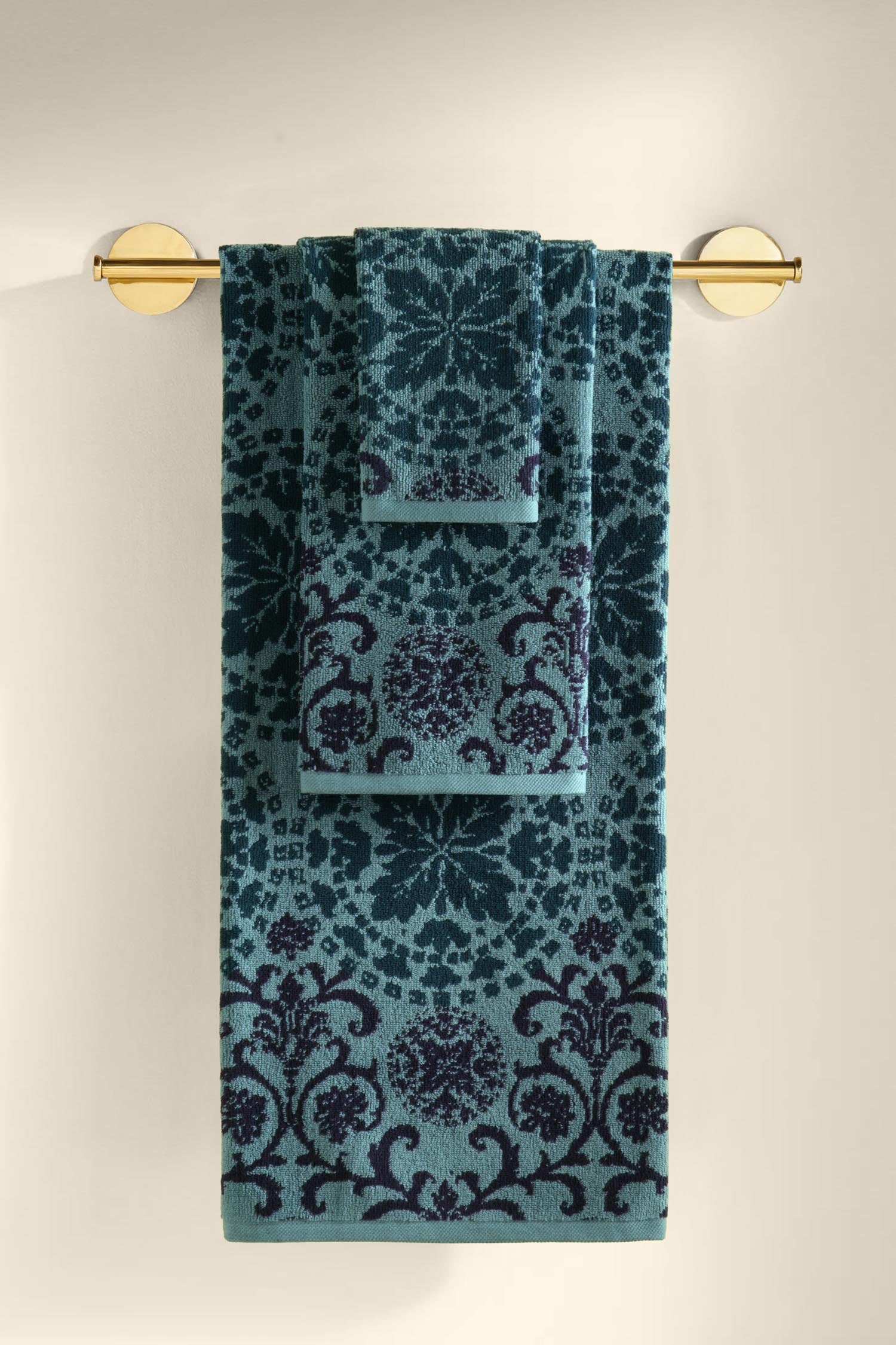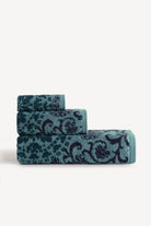 Matilda 3’lü havlu seti, geleneksel motif dokusunu modern petrol tonuyla birleştirerek banyolara zamansız bir şıklık taşır. El, banyo ve misafir havlusunun uyumu, hem dekoratif hem fonksiyonel bir bütünlük sunar.