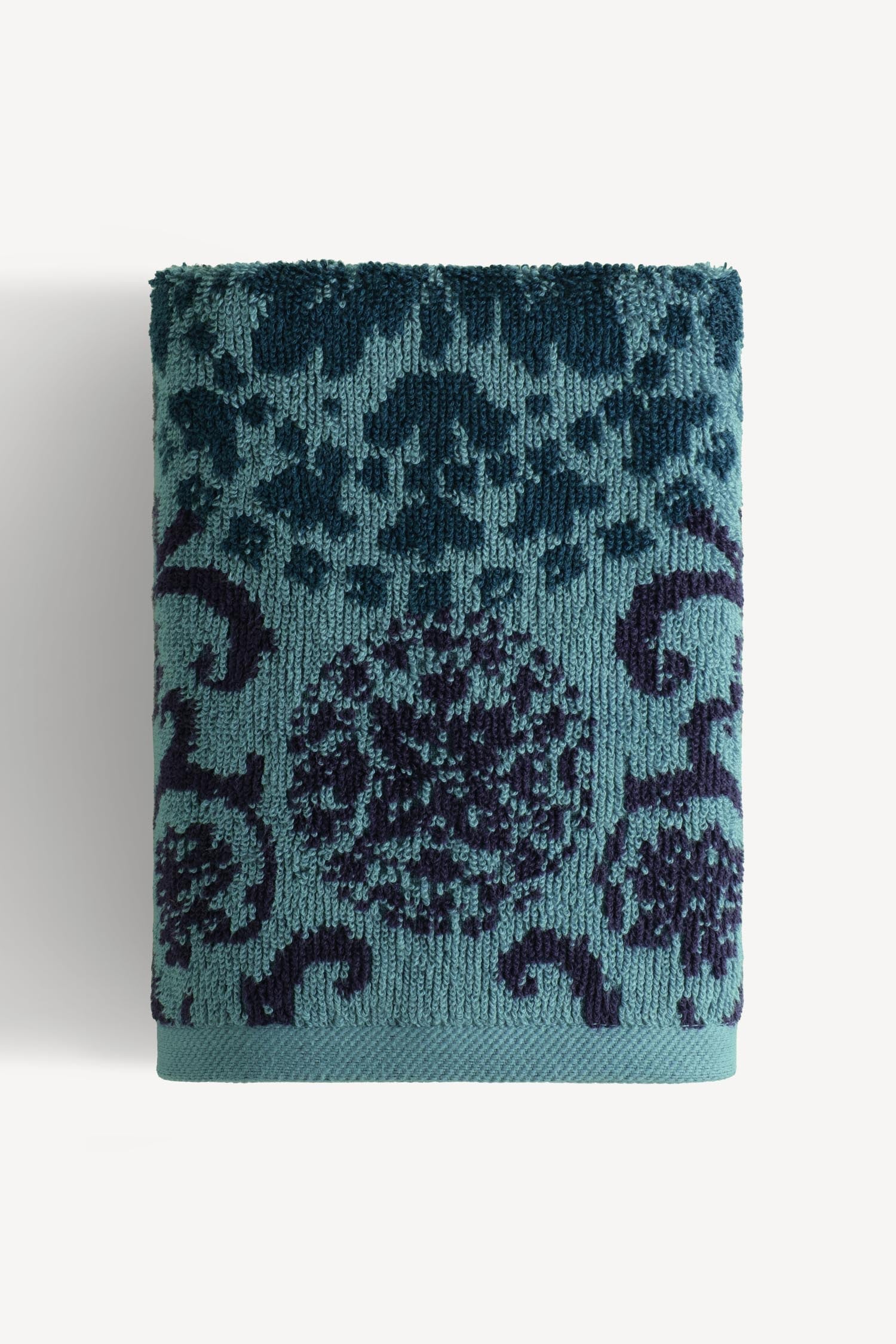 Matilda el havlusu, pamuk dokusunun sunduğu yumuşaklık ve güçlü emicilikle pratik kullanım sunar. Desenin dikkat çekici zarafeti, tekli havluyu banyolarda öne çıkan bir tamamlayıcıya dönüştürür.