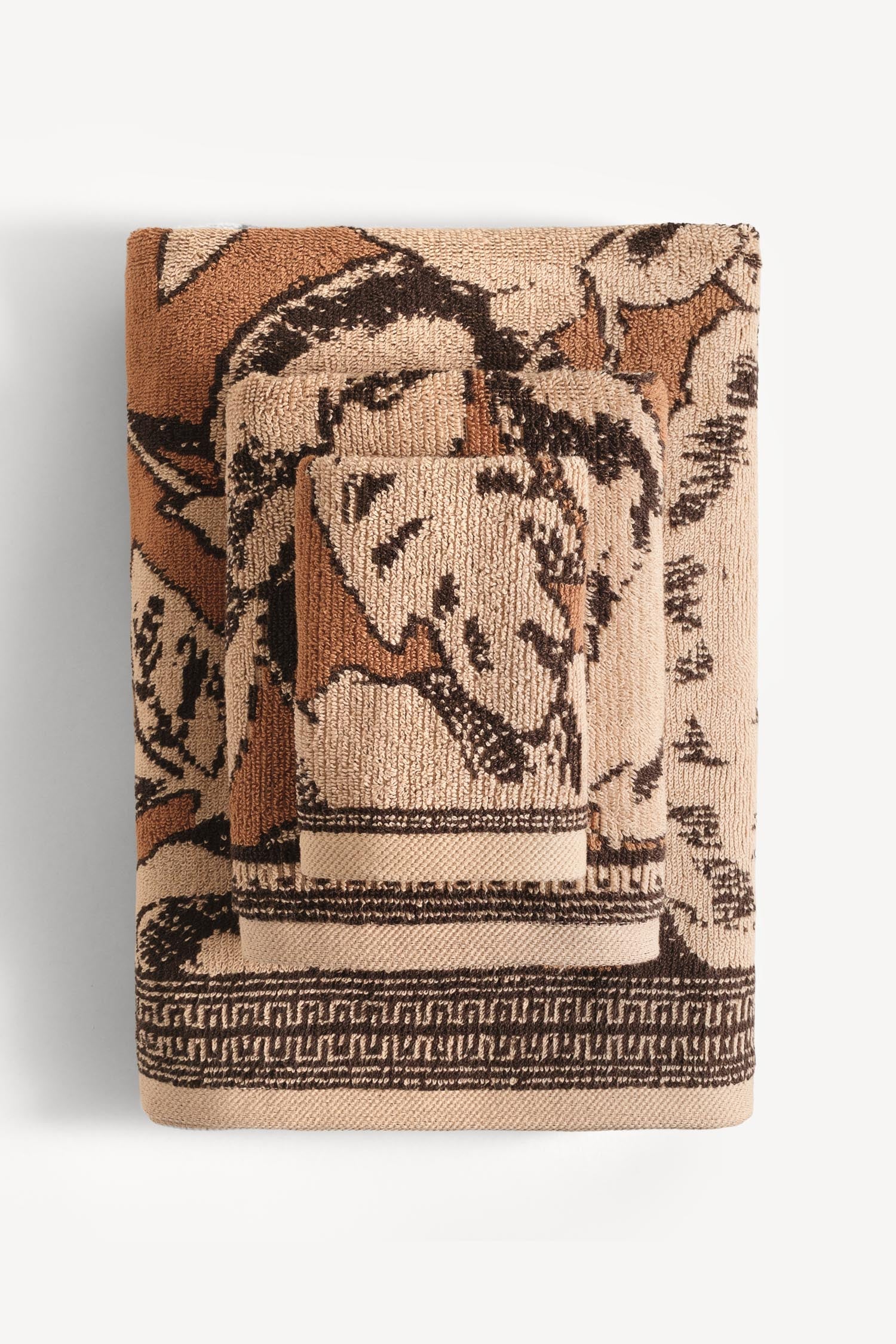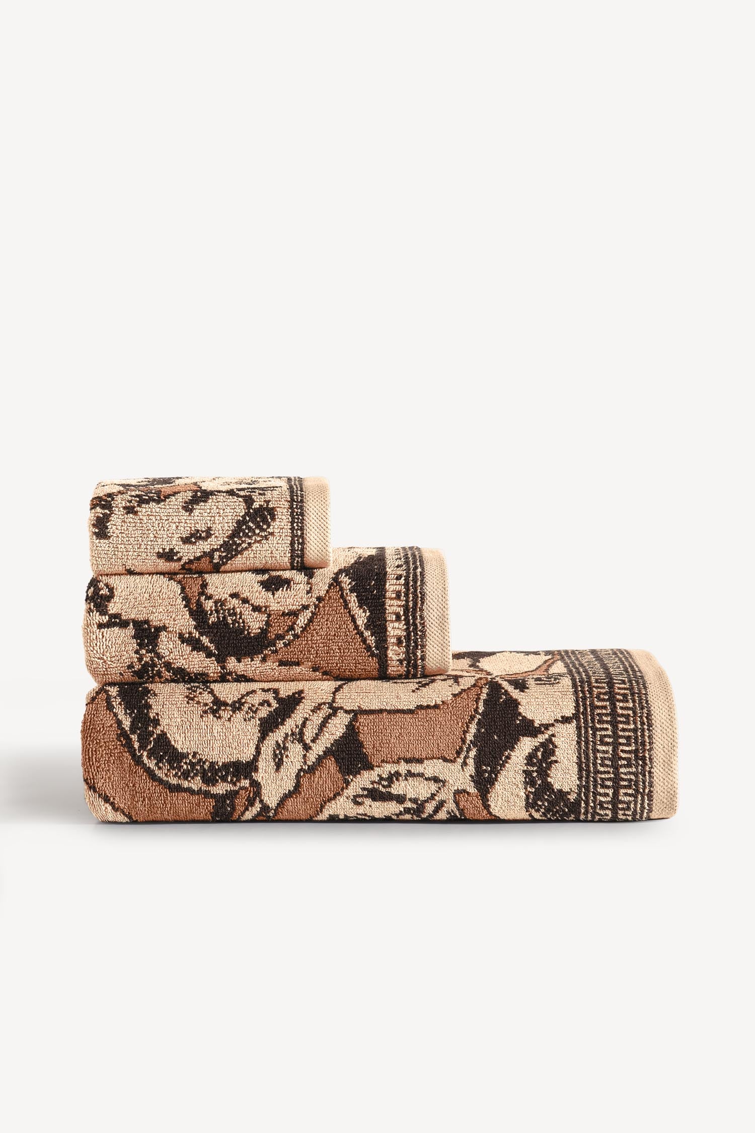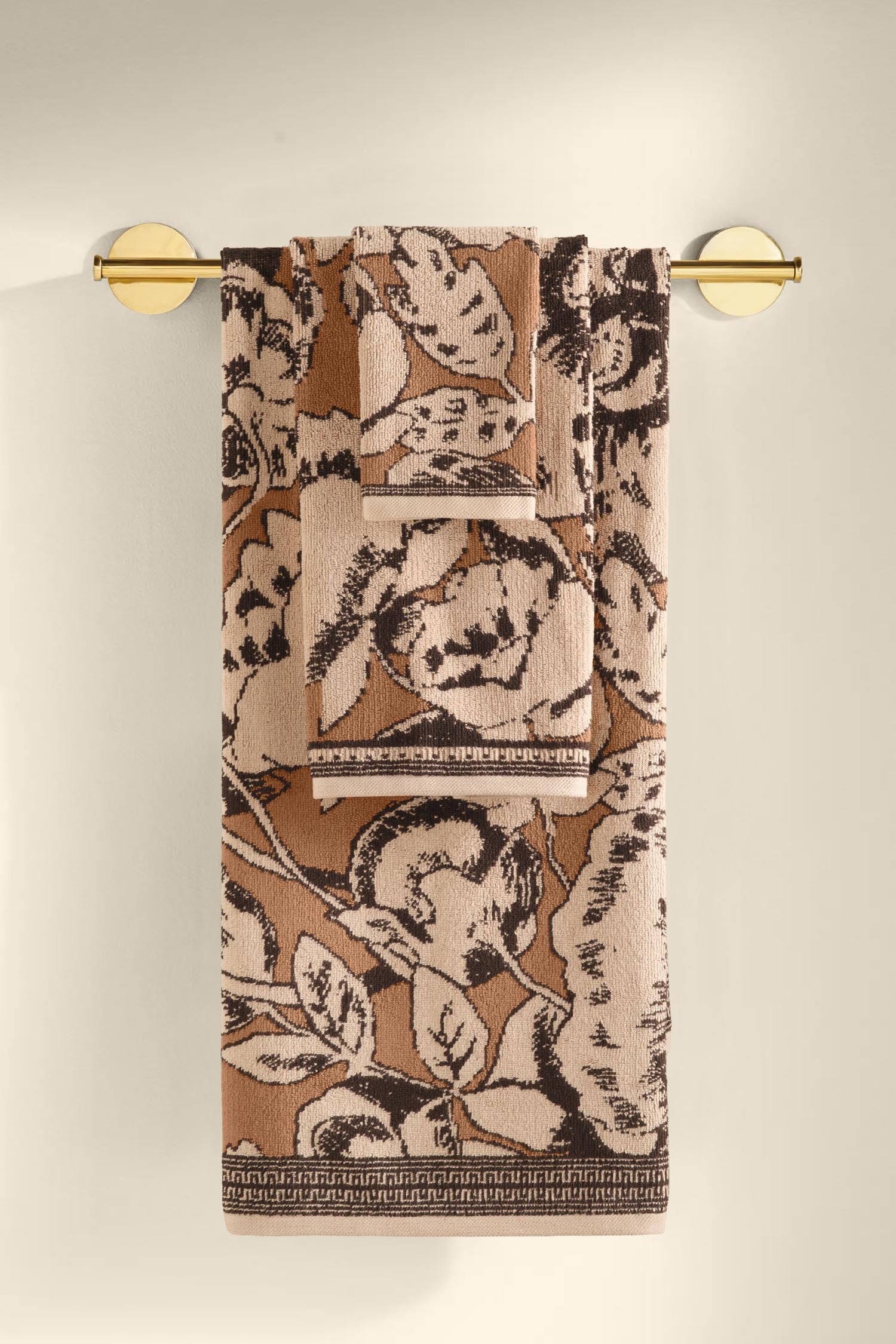 Sıcak karamel tonunu kahverengi çiçek motifleriyle buluşturan Caressa, banyolara doğal bir zarafet ve yumuşak bir sıcaklık taşır. Set içerisindeki el, banyo ve misafir havlusu, aynı tasarım dilini paylaşarak bütünsel bir şıklık oluşturur.