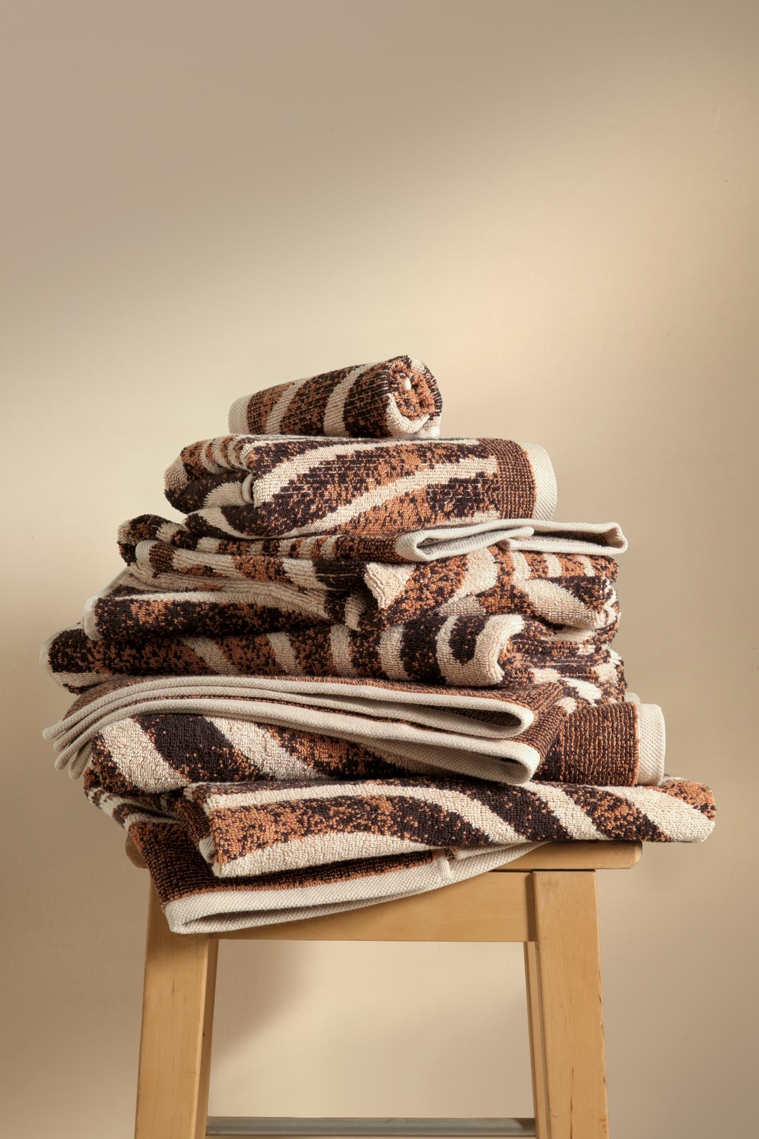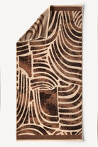 Karamel tonlarının sıcaklığını koyu kahve dalga çizgileriyle buluşturan Pluma, banyo havlusuna modern ve enerjik bir karakter kazandırır. Geniş yüzeyde ilerleyen akışkan grafik yapı, ipliği boyalı dokumanın sağladığı berraklık sayesinde uzun süre aynı çarpıcı görünümünü korur.