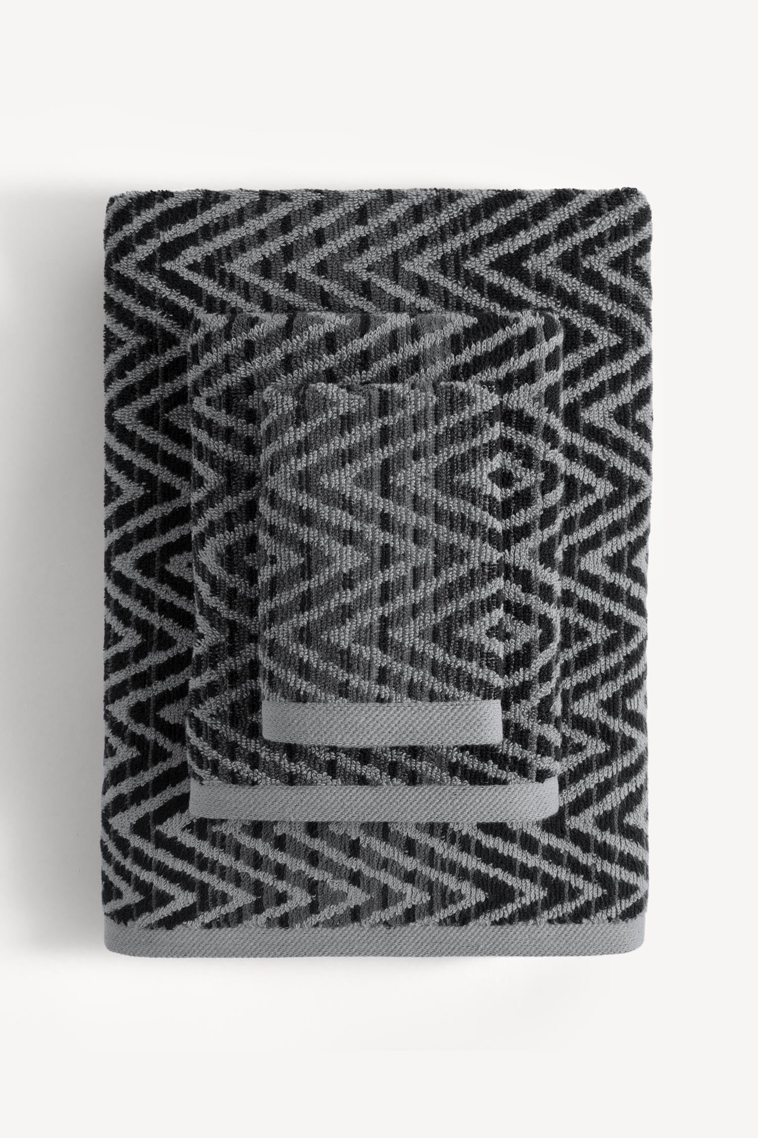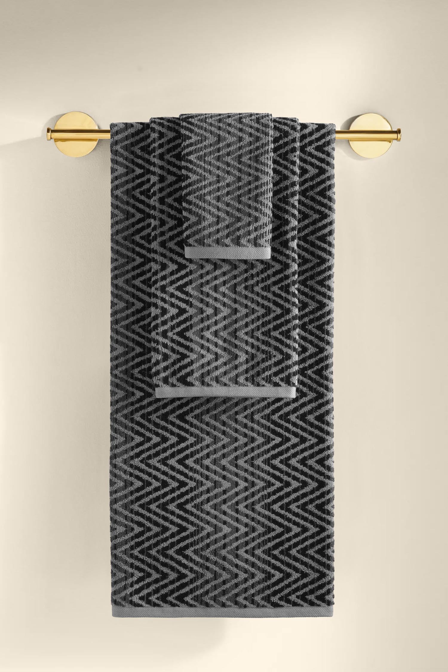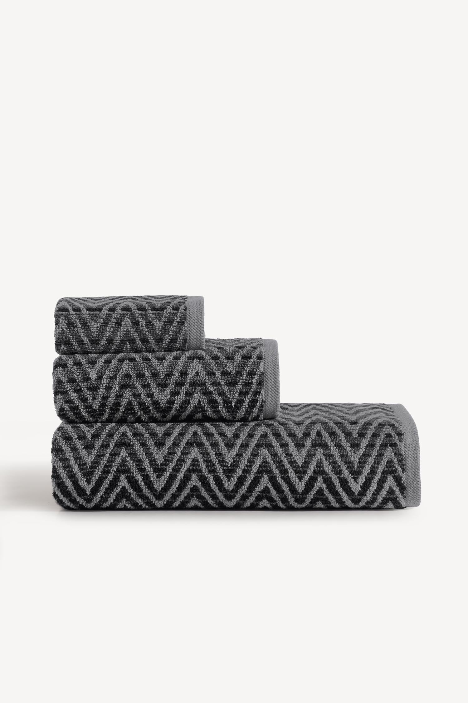 Antrasit renginin derin ve modern tonları, Zyon’un güçlü zigzag çizgileriyle birleşerek banyolara sofistike ve enerjik bir görünüm kazandırır. Set içerisindeki üç havlu da aynı modern tasarım dilini paylaşır.