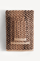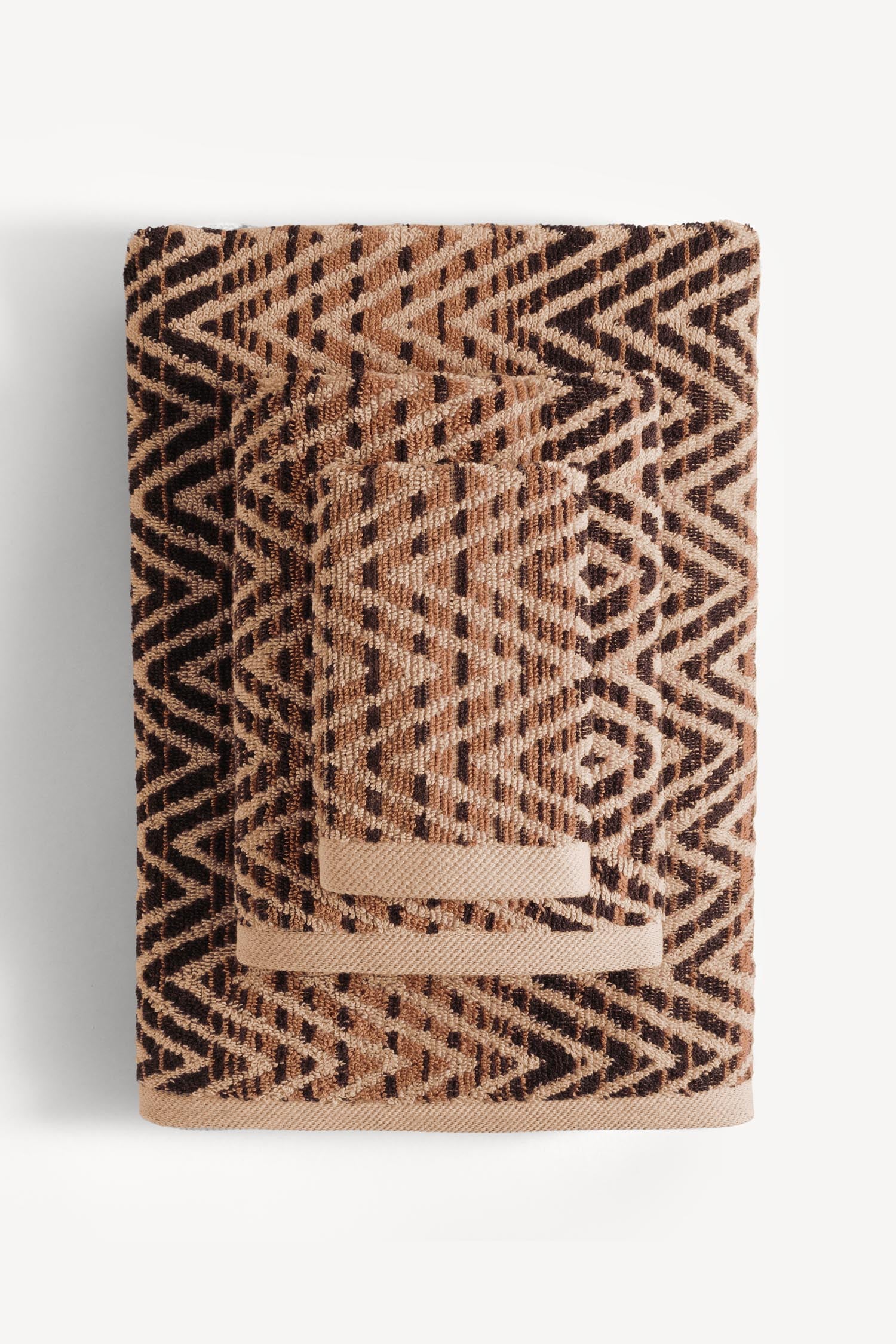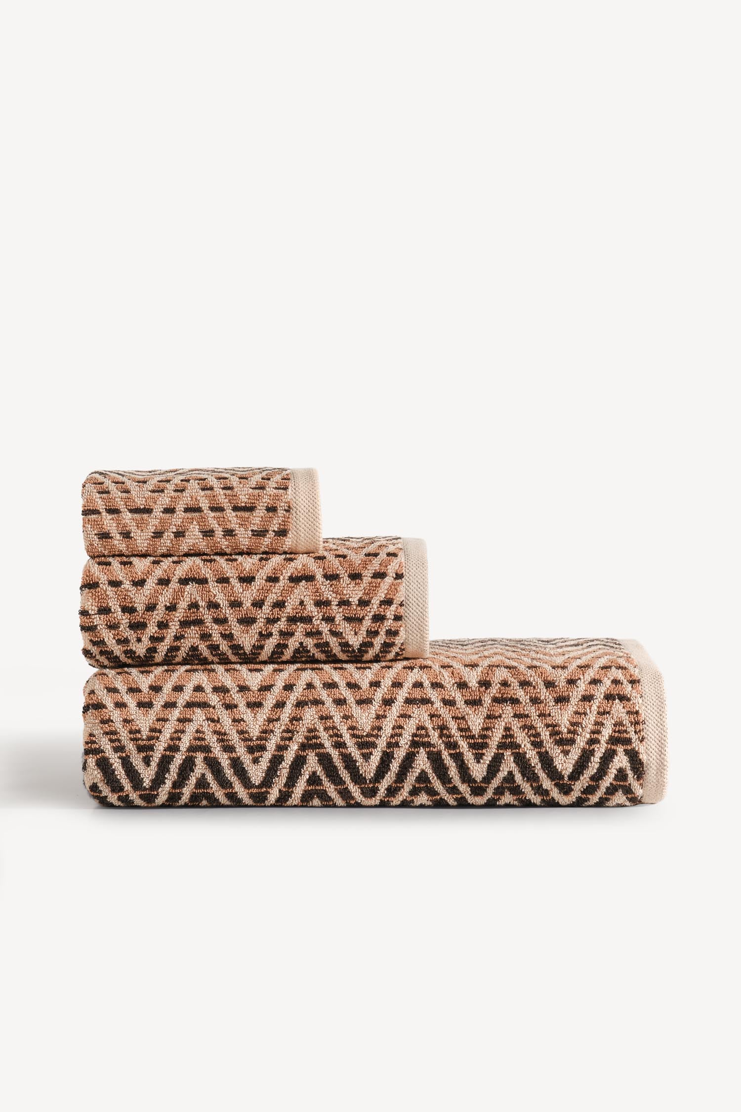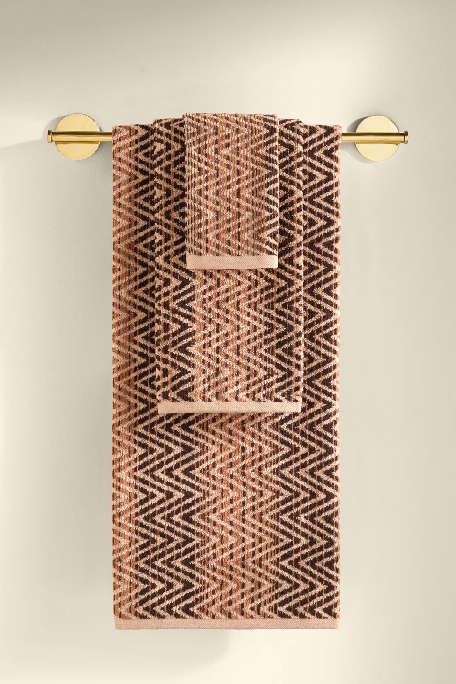 Karamel tonlarının sıcaklığı, Zyon’un modern zigzag çizgileriyle birleşerek banyolara enerjik ve çağdaş bir hava kazandırır. El, banyo ve misafir havlusundan oluşan bu set; geometrik desenin netliğini, rengin sıcaklığını ve pamuk dokusunun yumuşaklığını bir araya getirir.
