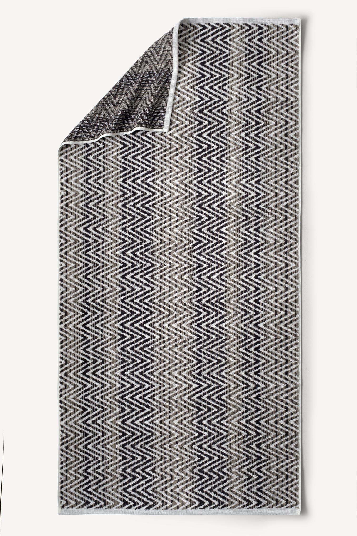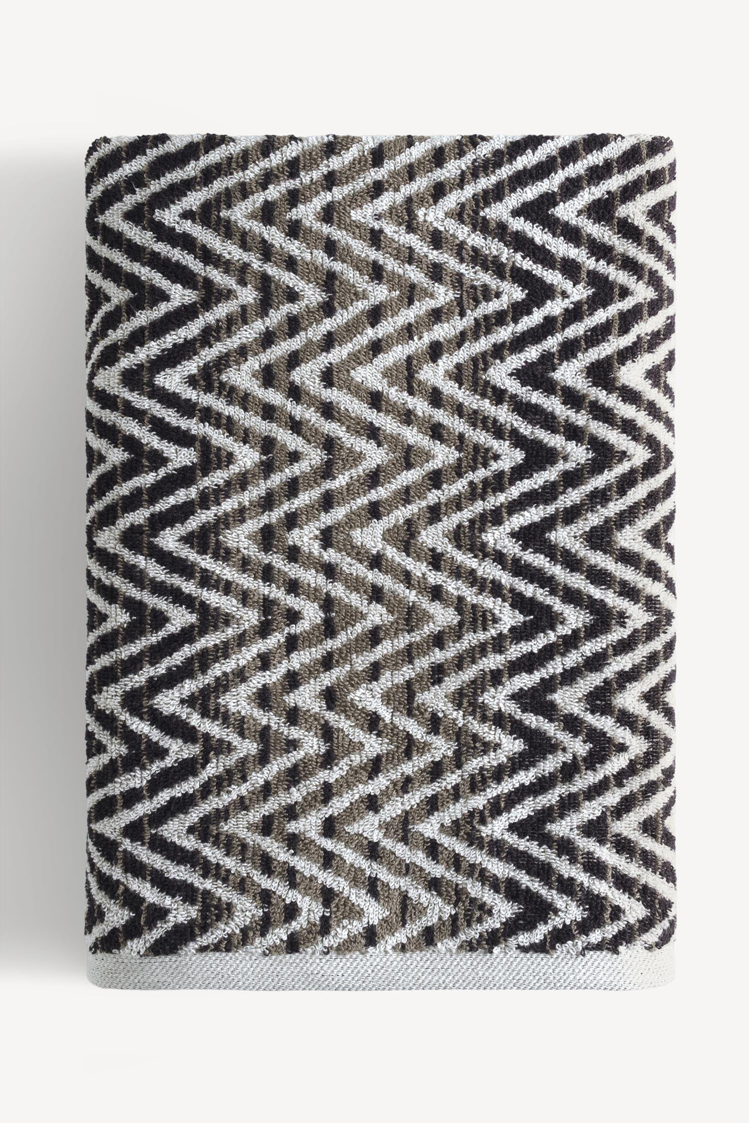 Taş renginin doğal sadeliği, Zyon’un düzenli zigzag çizgileriyle birleşerek banyo havlusuna ferah ve modern bir görünüm kazandırır. Geniş yüzeydeki grafik akış, ipliği boyalı dokuma tekniği sayesinde uzun süre bozulmaz.