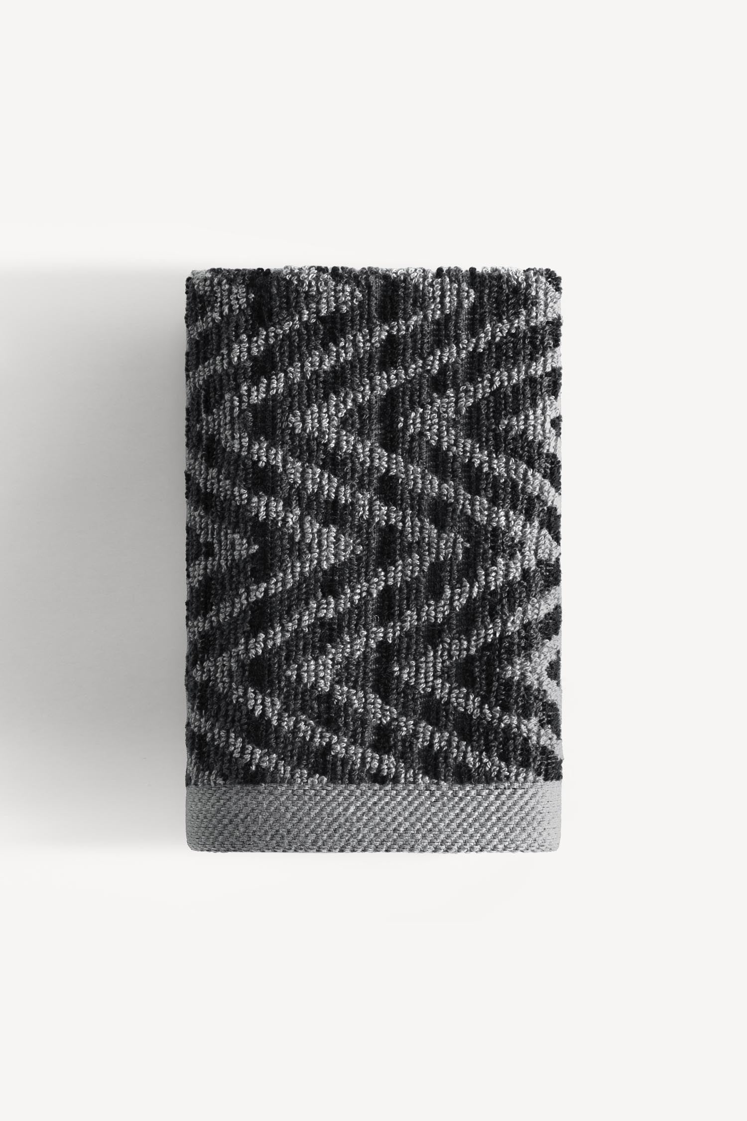 Antrasit tonlarının güçlü karakteri, Zyon’un keskin zigzag çizgileriyle birleşerek misafir havlularında modern ve sofistike bir duruş yaratır. Grafik desenlerin belirgin etkisi, ipliği boyalı dokuma sayesinde uzun süre ilk günkü netliğini korur.