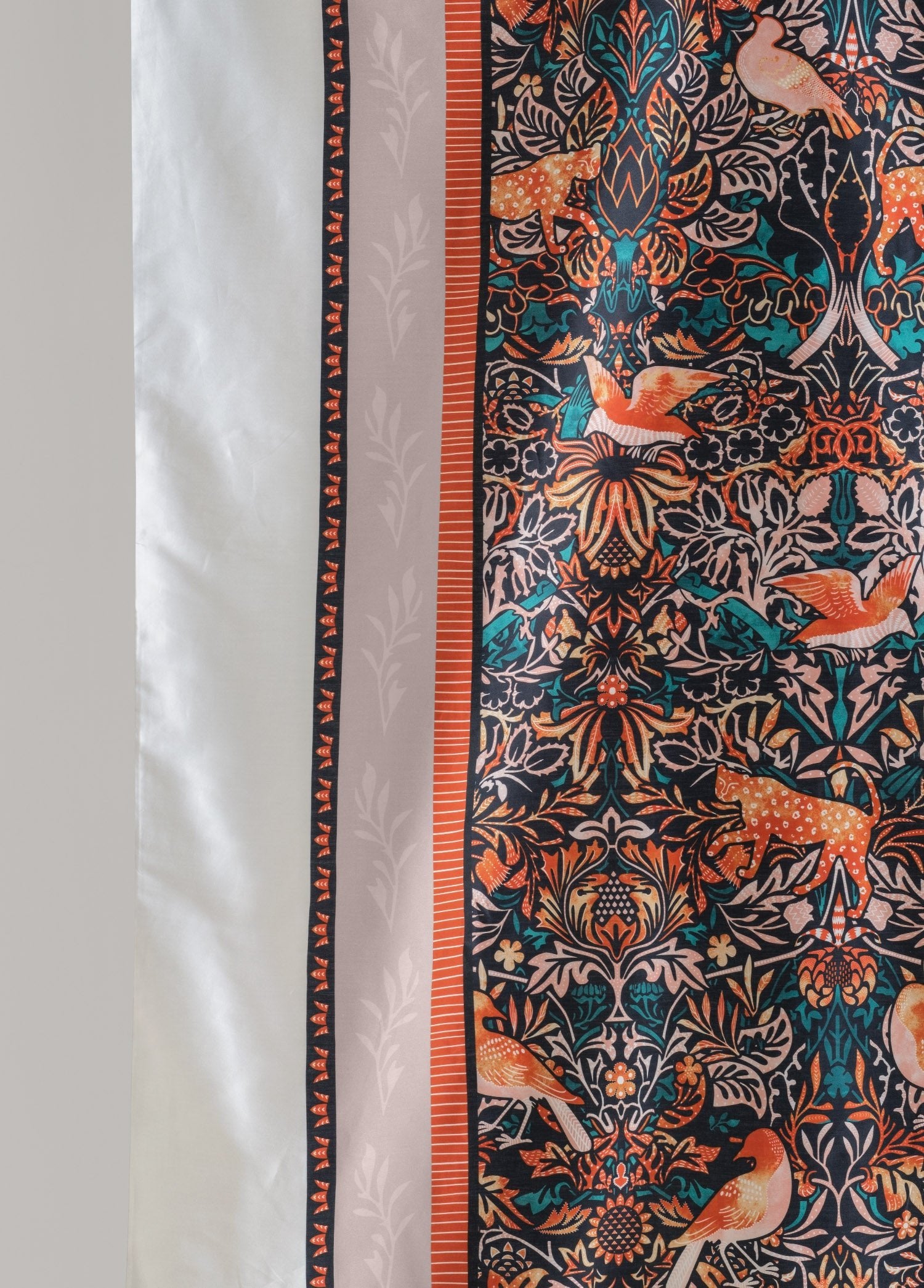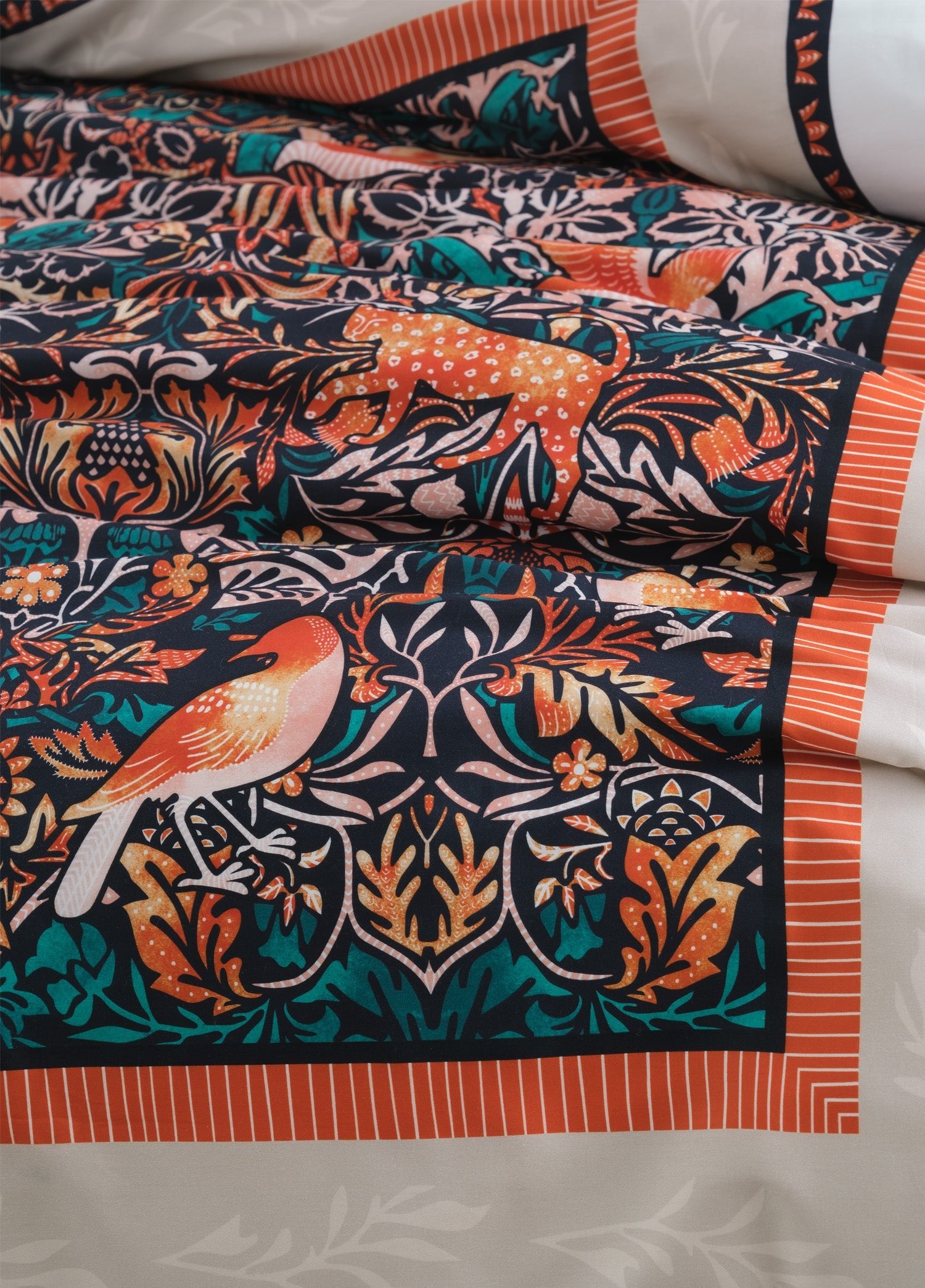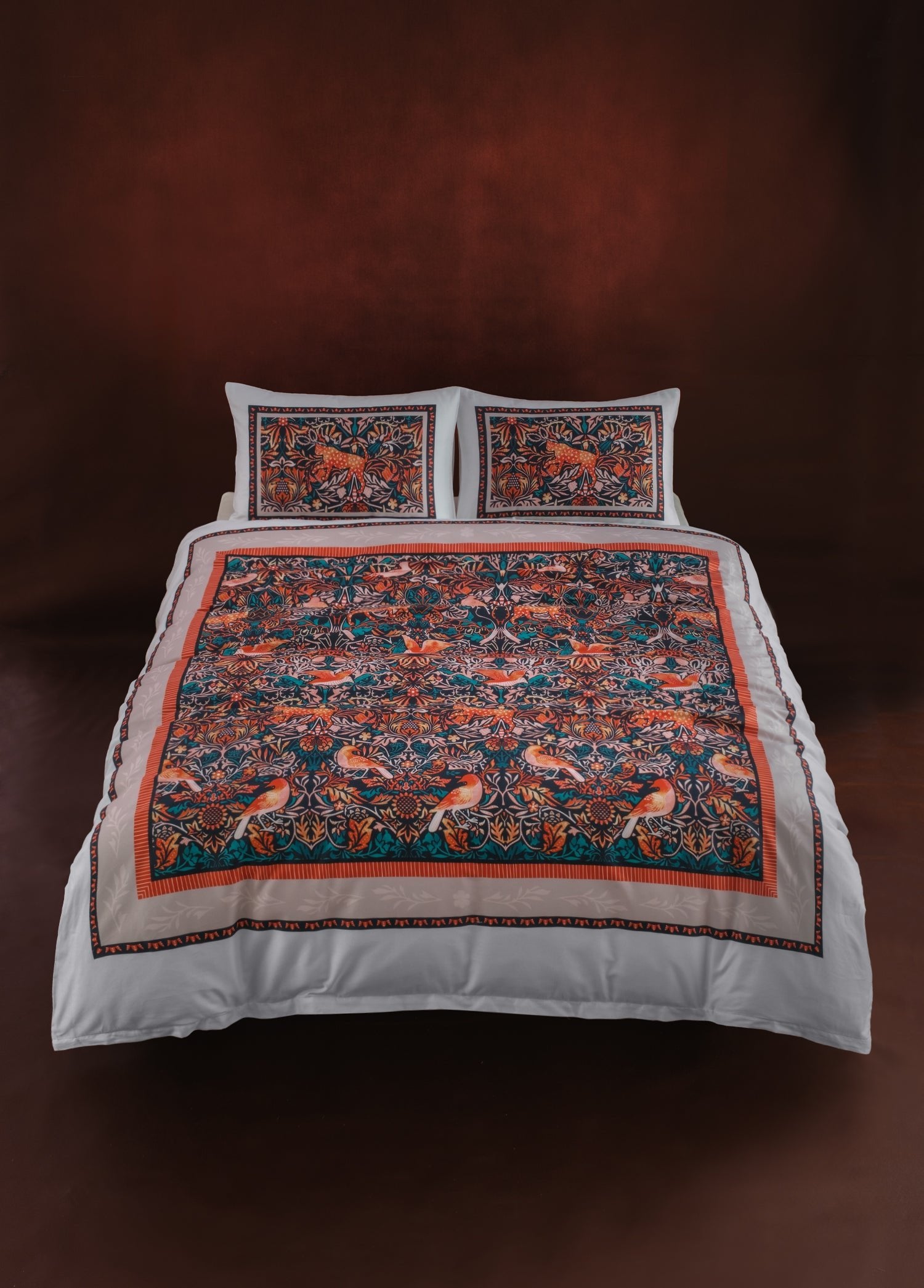Mara, doğanın canlılığını ve ihtişamını kumaş üzerinde yeniden yorumluyor. Koyu lacivert zemin üzerinde öne çıkan turuncu ve mercan tonlarındaki kuşlar, zarif bitki motifleriyle birlikte ritmik bir bütünlük oluşturuyor. Yoğun desen düzeni, klasik dokuma sanatını anımsatan bir incelik taşırken; renklerin kontrastı yatak odasına enerjik, göz alıcı ve sofistike bir atmosfer katıyor.