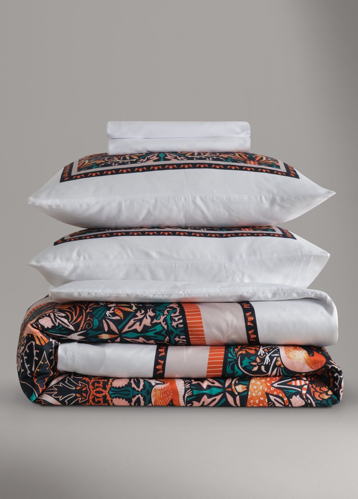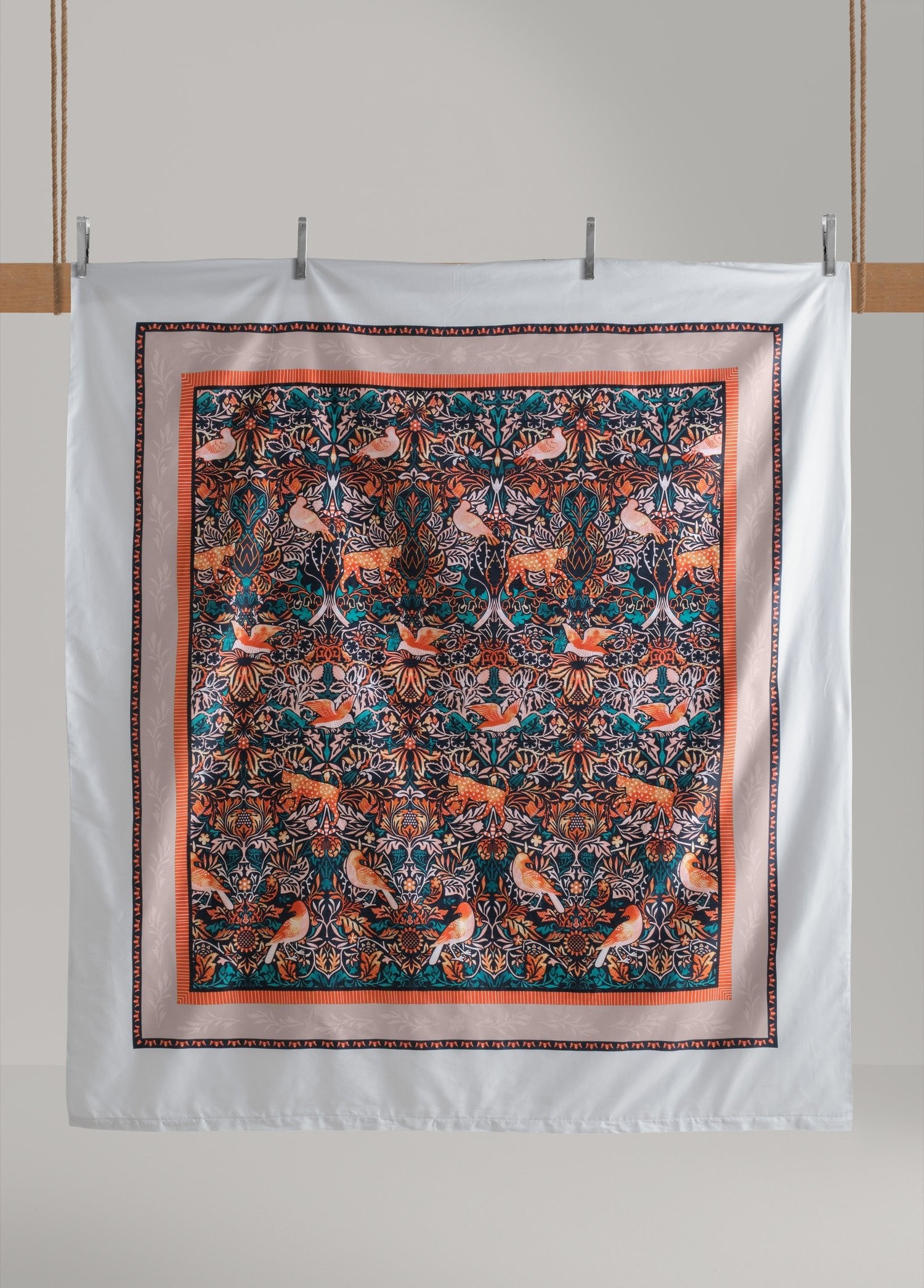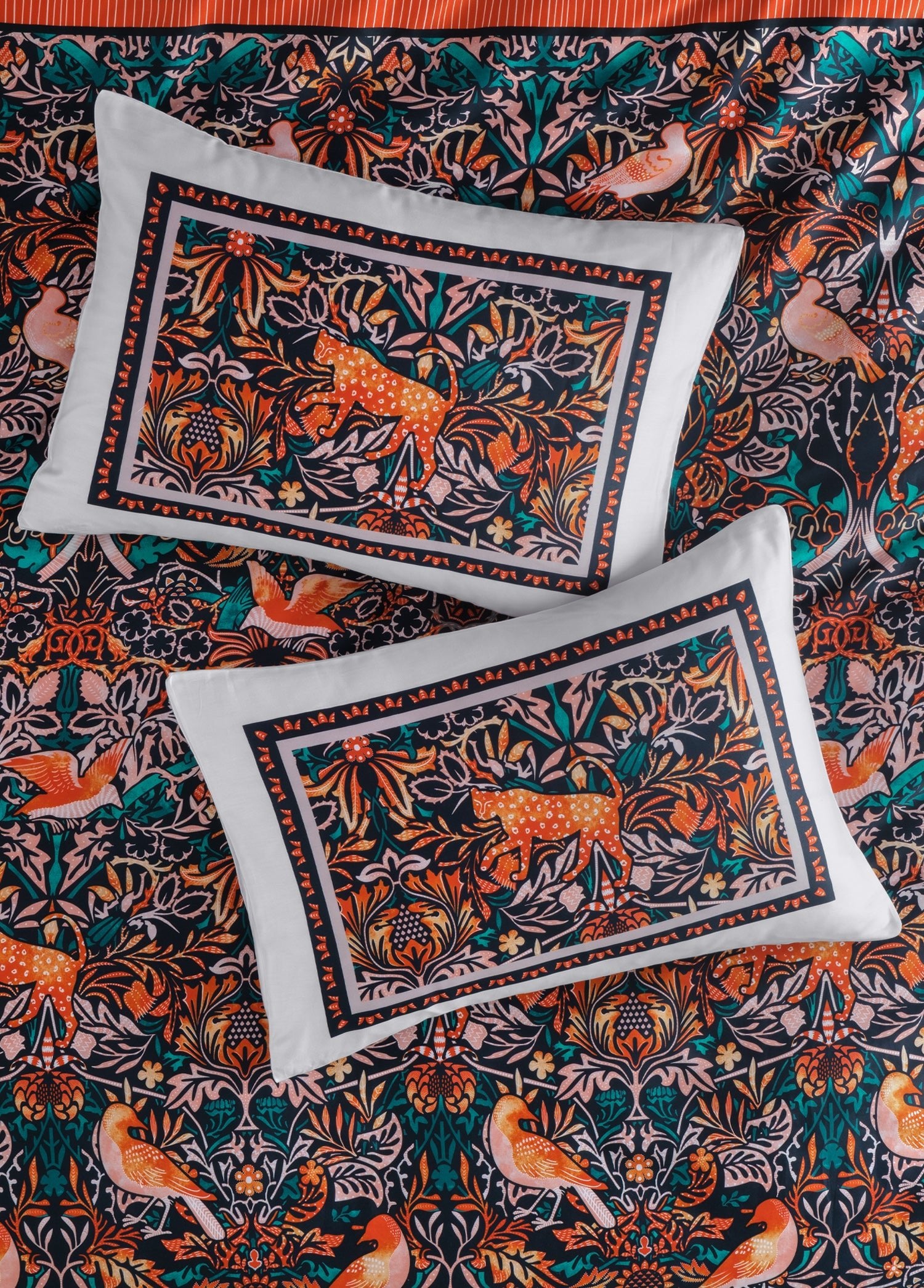 Mara, doğanın canlılığını ve ihtişamını kumaş üzerinde yeniden yorumluyor. Koyu lacivert zemin üzerinde öne çıkan turuncu ve mercan tonlarındaki kuşlar, zarif bitki motifleriyle birlikte ritmik bir bütünlük oluşturuyor. Yoğun desen düzeni, klasik dokuma sanatını anımsatan bir incelik taşırken; renklerin kontrastı yatak odasına enerjik, göz alıcı ve sofistike bir atmosfer katıyor.